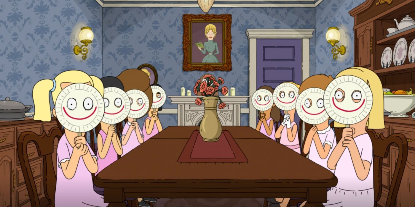 Donna Dane’s Etiquette Camp for Good Girls is in the middle of the woods. The women in charge invite them in only for Tina to realize not everything is quite right. Inside, the Thundergirls and herself pass by a dining room where young girls sit around a table holding paper masks in front of their faces, with a big grin drawn on each. Should any of the girls at this etiquette camp act out even in small ways like a giggle, they are reprimanded by putting a “quiet stone” in their mouths. It’s almost a jump scare when Bob’s Burgers lets the viewers peek into that dining room. Stranded at the house with rival Thundergirls and with the women in charge not letting them leave, Tina tries to remain calm, but she has every right to freak out.